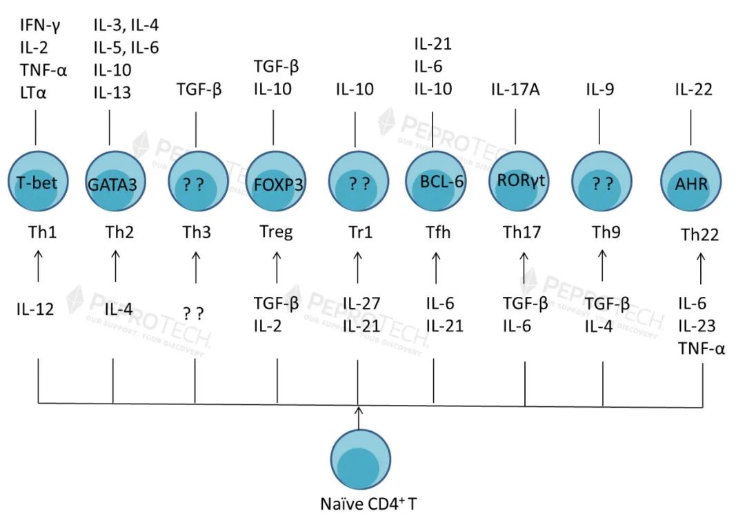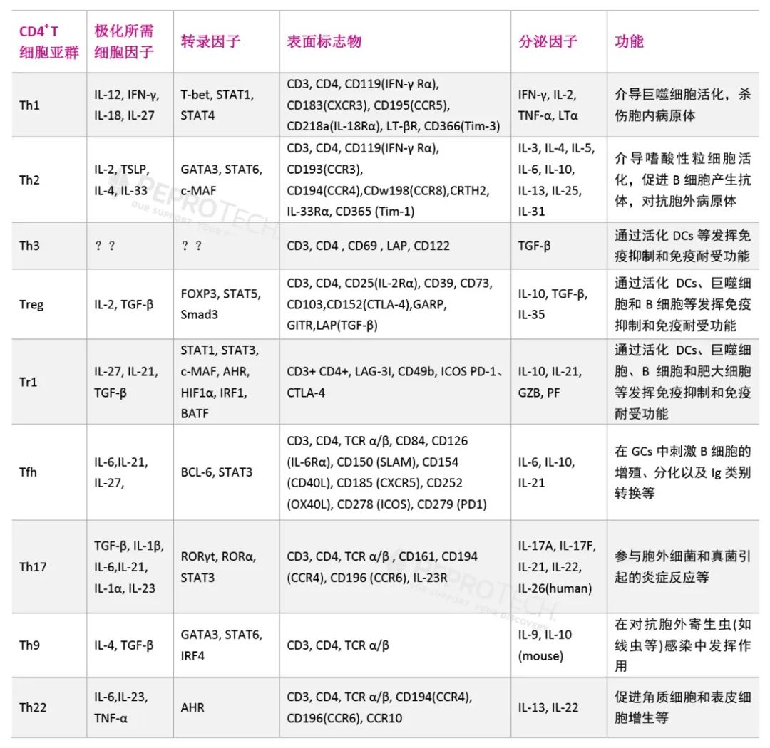 2. Chen Y., et al., (1994) Regulatory T cell clones induced by oral tolerance:suppression of autoimmune encephalomyelitis. Science. 265(5176):1237–40.3. Oida T., et al., (2003) CD4+CD25- T cells that express latency-associated peptide on the surface suppress CD4+CD45RBhigh-induced colitis by a TGF-beta-dependent mechanism. J Immunol. 170(5):2516–22.4. Han Y., et al., (2009) CD69+ CD4+ CD25- T cells, a new subset of regulatory T cells, suppress T cell proliferation through membrane-bound TGF-beta 1. J Immunol. 182(1):111–20.5. Sakaguchi S., et al., (1995) Immunologic self-tolerance maintained by activated T cells expressing IL-2 receptor alpha-chains(CD25).Breakdown of a single mechanism of self- tolerance causes various autoimmune diseases[J]. Journal of Immunology, 155( 3) : 1151-1164.6. Betts G., et al., (2007) The impact of regulatory T cells on carcinogen-induced sarcogenesis[J]. British J Cancer, 96( 12) : 1849-1854.7. Groux H., et al., (1995) A CD4+ T-cell subset inhibits antigen-specific T-cell responses and prevents colitis. Nature. 389(6652):737–42.8. Groux H., et al., (1997) A CD41 T-cell subset inhibits antigen-specific T-cell responses and prevents colitis. Nature. 389: 737–742.9. Cobbold SP., et al., (2003) Regulatory T cells and dendritic cells in transplantation tolerance: molecular markers and mechanisms. Immunol Rev . 196: 109–124.10. Bergmann C., et al., (2007) Expansion of human T regulatory type 1 cells in the microenvironment of cyclooxygenase 2 overexpressing head and neck squamous cell carcinoma. Cancer Res . 67: 8865–8873.11. Schaerli P., et al., (2000) Cxc Chemokine Receptor 5 Expression Defines Follicular Homing T Cells with B Cell Helper Function [J]. J Exp Med, 2000, 192(11): 1553-62.12. Wu HY., et al., (2008) Nasal anti-CD3 antibody ameliorates lupus by inducing an IL-10-secreting CD4+CD25-LAP+regulatory T cell and is associated with down-regulation of IL-17+CD4+ICOS+CXCR5+ follicular helper T cells[J]. Immunol,181( 9) : 6038.13. Rodriguez Pinilla S M., et al., (2009) Primary cutaneous CD4+ small/medium-sized pleomorphic T-cell lymphoma expresses follicular T-cell markers [J].Am J Surg Pathol, 33(1):81-90.14. Park H., et al., (2005) Distinct Lineage of CD4 T Cells Regulates Tissue Inflammation by Producing Interleukin 17 Nat Immunol, 6 (11), 1133-4115. Harrington LE., et al., (2005) Inerleukin 17 pro-ducing CD4+effector T cells develop via a lineage distinct from the T helper type 1 and 2 lineages [J]. Nat Immunol, 6 ( 11): 1123-1132.16. Tartour E., et al., (1999) Interleukin 17,a T-cell derivedcytokine,promotes tumorigenicity of human cervical tumors in nude mice [J].Cancer Res, 1999, 59(15):3698-3704.17. Martinorozco N., et al., (2009) T Helper 17 cells promote cytotoxic T tell activation in tumor immunity [J]. Immunity,31(5):787-798.18. Veldhoen M., et al., (2008) Transforming Growth Factor-Beta 'Reprograms' the Differentiation of T Helper 2 Cells and Promotes an Interleukin 9-producing Subset[J].Nat immunol, 9 (12): 1341- 1346.19. Dardalhon V., et al., (2008) IL-4 Inhibits TGF-beta-induced Foxp3+ T Cells And, Together With TGF-beta, Generates IL-9+ IL-10+ Foxp3(-) Effector T Cells [J]. Nat Immunol, 9(12): 1347- 1355.20. Lv X., et al., (2016) Interleukin-9 promotes cell survival and drug resistance in diffuse large B-cell lymphoma [J]. J Exp Clin Cancer Res, 35( 1) : 106.21. Duhen T., et al., (2009) Production of interleukin 22 but not interleukin 17 by a subset of human skin-homing memory T cells.[J]. Nat Immunol, 10 (8), 857-6322. Trifari S., et al., (2009) Identification of a Human Helper T Cell Population That Has Abundant Production of Interleukin 22 and Is Distinct From T(H)-17, T(H)1 and T(H)2 Cells.[J]. Nat Immunol, 10 (8), 864-71
