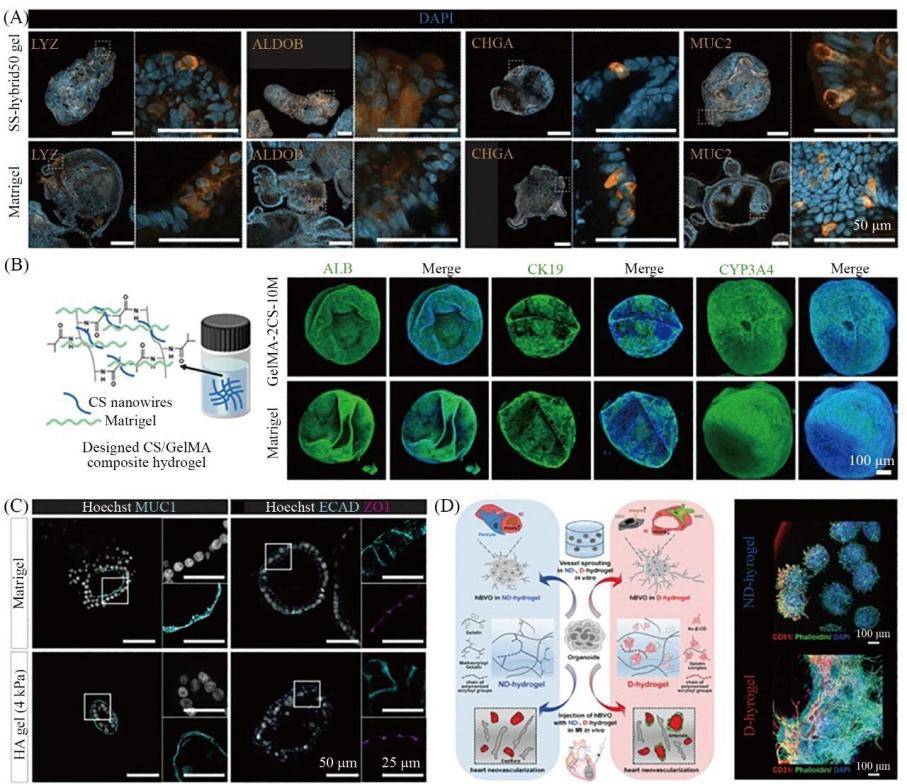 合成水凝胶是通过化学合成方法制备的高分子材料,具有成分明确、批次稳定性高、免疫原性低等优点,其机械性能(如刚度、黏弹性)、降解动力学及生物活性配体均可被精确设计和调控。这有效弥补了基质胶成分复杂、批次差异大、理化性质调控受限等缺陷,使研究者能够单独探究某一微环境因素对类器官发育的影响,为构建标准化、可重复的类器官模型提供了理想平台。
