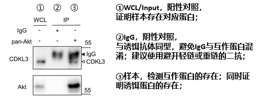 通常检测如图1所示,该文章通过co-IP验证CDKL3和Akt是否存在相互作用,以Akt抗体富集该Akt蛋白,在③泳道检测出CDKL3与Akt的存在,表明该样本中两个蛋白存在相互作用。