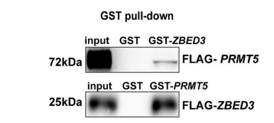 以图2为例,该文章通过GST-ZBED3和GST-PRMT5分别下拉了FLAG-PRMT5与FLAG-ZBED3,表明这两个蛋白存在直接相互作用。