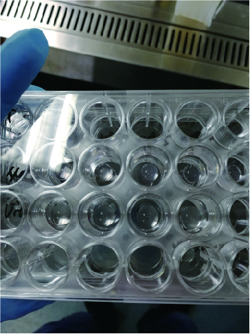 14、吸取 50 μL 悬液,加入到提前预热的 24 孔板每个孔中的中心部位,样品应在每个孔的中心形成圆顶结构。为了防止接种时出现气泡,枪头内液体不要全部打出;