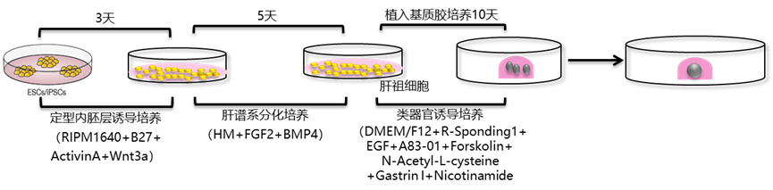 人肝脏类器官以hESCs/iPSCs 为来源,将其诱导到定型内胚层,再诱导肝谱系特化的阶段(HS),将细胞植入细胞外基质胶中,并且添加类器官培养成分Advanced DMEM/F12 、N2 、B27 、N-Acety-L-Cysteine、Gastrin、Nicotinamide、Glutamax、EGF、R-spondin1、A83-01 和Forskolin,进行3D培养获得肝脏干细胞类器官(hEHOs)。