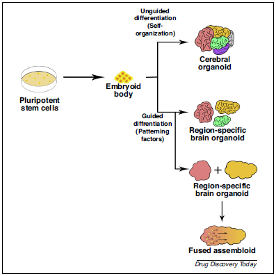 在类器官结构中,多能性干细胞(ESCs/iPSCs)诱导为拟胚体 (Embryoid Body, EB),在外胚层形成后,引导分化为神经或非神经方向。引导分化法获得的类器官依赖分化过程中添加的生长因子,大多数是脑区特异性的,如皮层、海马、中脑、大脑等。引导分化法得到的类器官含有神经祖细胞、神经元、星形胶质细胞及其他的大脑细胞。由于是引导性分化,批次间的可变因素少,可以产生对应比例的特异性细胞类型。很多团队都在尝试用不同的方法来培养类器官,分别培养脑区特异的类器官后再将其共培养,类器官会自我融合形成含有不同脑区的类器官,该模型可以用于研究脑区间的相互作用。