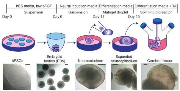 2013年,Lacaster和Knoblich等发表在Nature及Nature protocol上的3D大脑类器官的制作方法使得体外用人多能干细胞 (包括胚胎干细胞及诱导多能干细胞)诱导3D大脑类器官的技术前进了一大步,他们通过使用一种允许类器官获取能量和氧气的新方法克服了这一局限,使用一个微小的振动刀片将类器官切成半毫米切片,然后将它们放在覆盖富含营养的液体的多孔膜上。然后,类器官可同时从上方吸收氧气,从下方吸收营养物质,使其在培养物中继续发育一年。图1是该方法的概括。